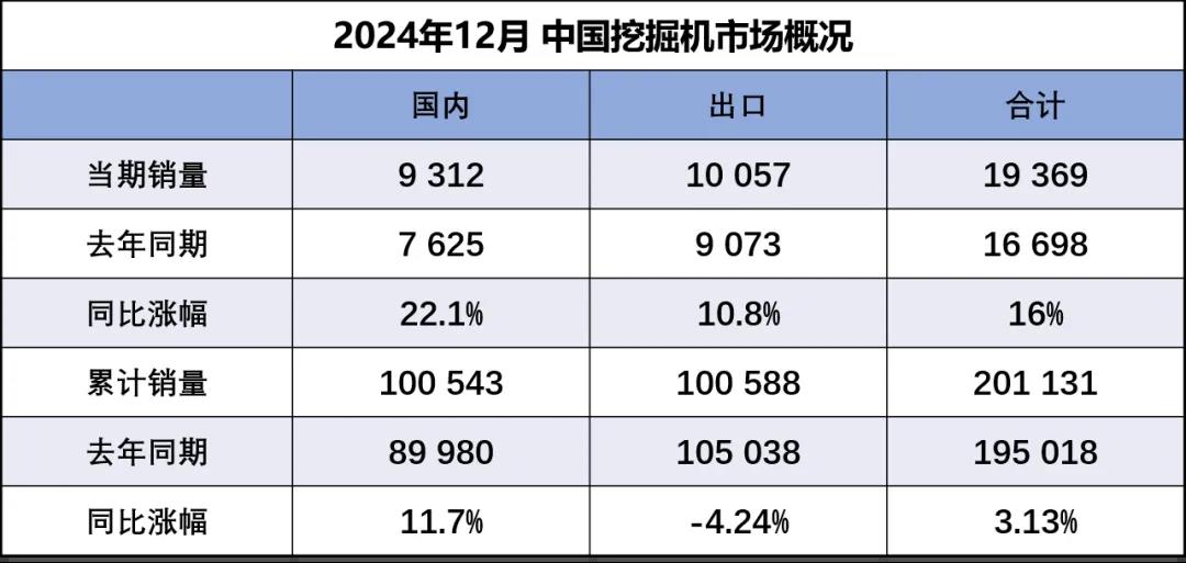 2025-01据中国工程机械工业协会对挖掘机主要制造企业统计,2024年12月销售各类挖掘机19369台,同比增长16%。其中国内销量9312台,同比增长22.1%;出口量10057台,同比增长10.8%。2024年,共销售挖掘机201131台,同比增长3.13%;其中国内销量10054…......