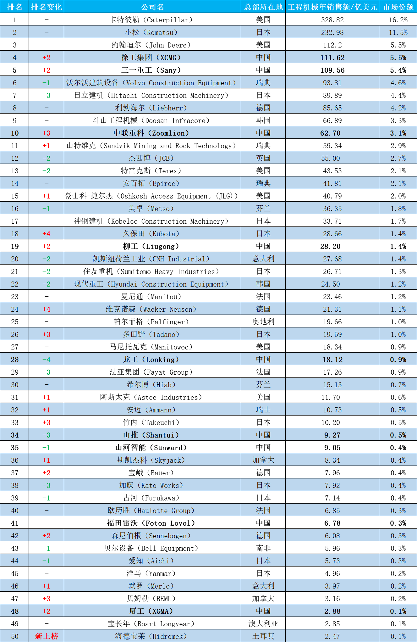 全球前50强主机制造商(Yellow Table排名)销售收入在经历了2013至2016年的下滑后,迎来了连续几年的增长。2020年5月18日,世界领先的工程信息提供商英国KHL集团发布了2020全球工程机械制造商50强排行榜(YellowTable…......