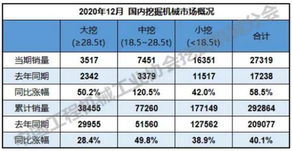 根据中国工程机械工业协会行业统计数据,2020年1—12月纳入统计的25家主机制造企业,共计销售各类挖掘机械产品327,605台,同比涨幅39.0%。国内市场销量292,864台,同比涨幅40.1%。出口销量34,741台,同比涨幅30.5%。2…......