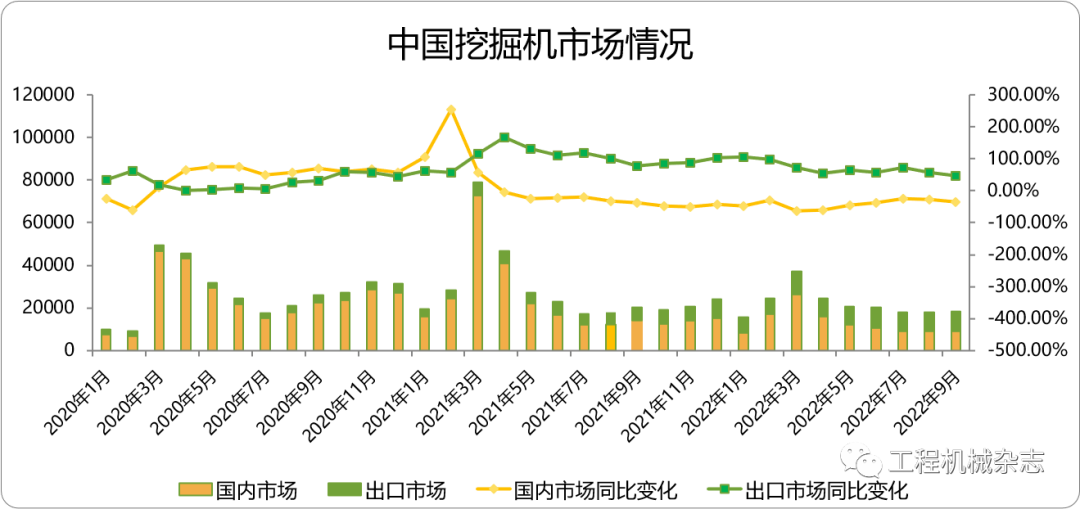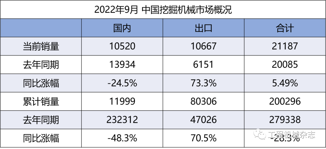 据中国工程机械工业协会对26家挖掘机制造企业统计,2022年9月销售各类挖掘机21187台,同比增长5.49%,其中国内10520台,同比下降24.5%;出口10667台,同比增长73.3%。 2022年1-9月,共销售挖掘机200296台,同比下降28…......