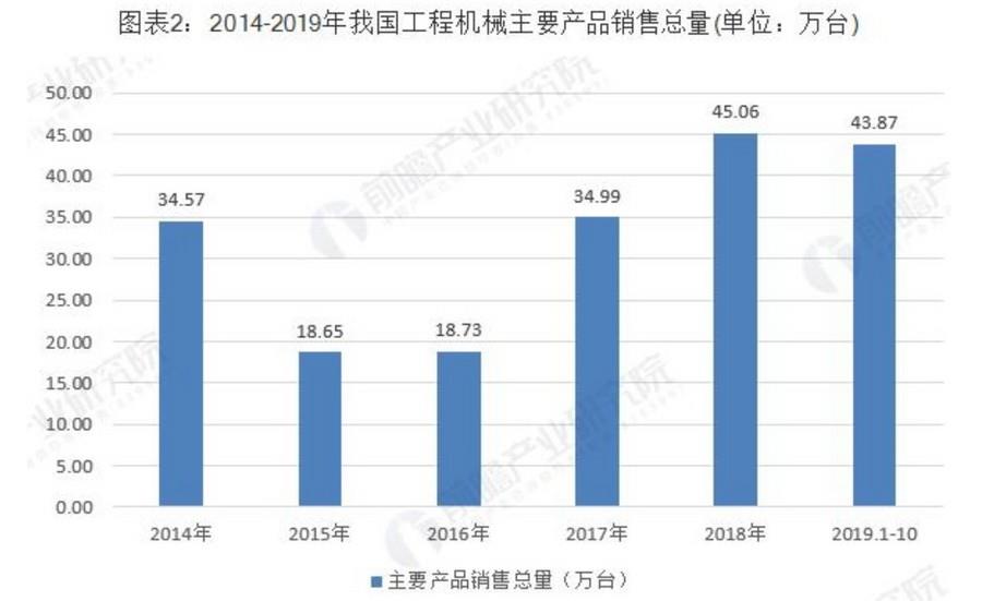 我国工程机械产品销量最高的为挖掘机,2018年挖掘机销量达到19.62万台;其次为装载机,销量达到10.33万台。2018年我国工程机械主要产品销售总量为45.06万台,2019年1-10月达到43.87万台。整体而言,我国工程机械产品销量呈上升趋势。