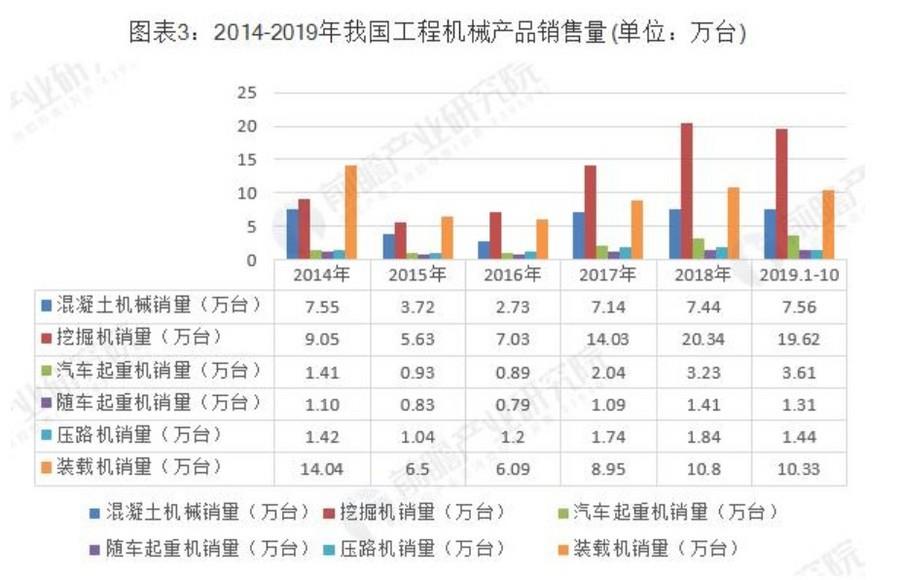 工程机械行业规模的持续增长体现在其主要产品销售量的增长。我国工程机械行业主要产品包括混凝土机械、工程起重机机械如汽车起重机、随车起重机;路面机械如压路机、挖掘机、装载机等,我国工程机械行业主要产品销售总量呈上涨趋势。