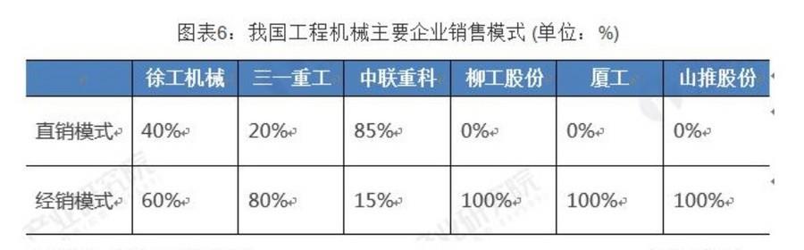 徐工机械与三一重工主要采用经销模式,经销模式比重分别达到60%与80%;而中联重科85%的工程机械主要采用直销模式进行销售;柳工股份、厦工、山推股份等企业全部工程机械均采用经销模