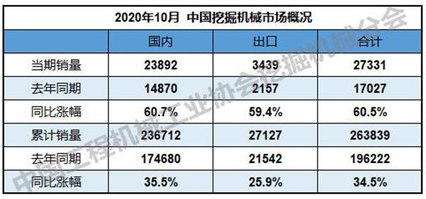 2020年1-10月,共销售挖掘机263839台,同比增长34.5%;其中国内236712台,同比增长35.5%;出口27127台,同比增长25.9%