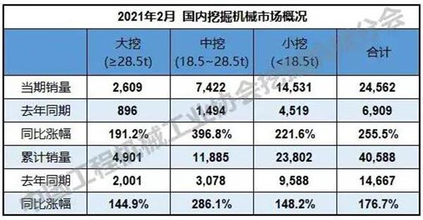 根据中国工程机械工业协会行业统计数据,2021年1—2月纳入统计的26家主机制造企业,共计销售各类挖掘机械产品47,906台,同比涨幅149.2%。其中,国内市场销量40,588台,同比涨幅176.7%;出口销量7,318台,同比涨幅60.7%。