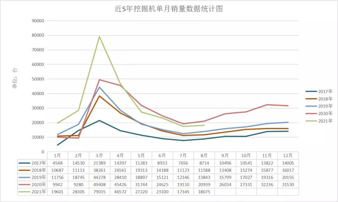据中国工程机械工业协会对25家挖掘机制造企业统计,2021年8月销售各类挖掘机18075台,同比下降13.7%;其中国内12349台,同比下降31.7%;出口5726台,同比增长100%。